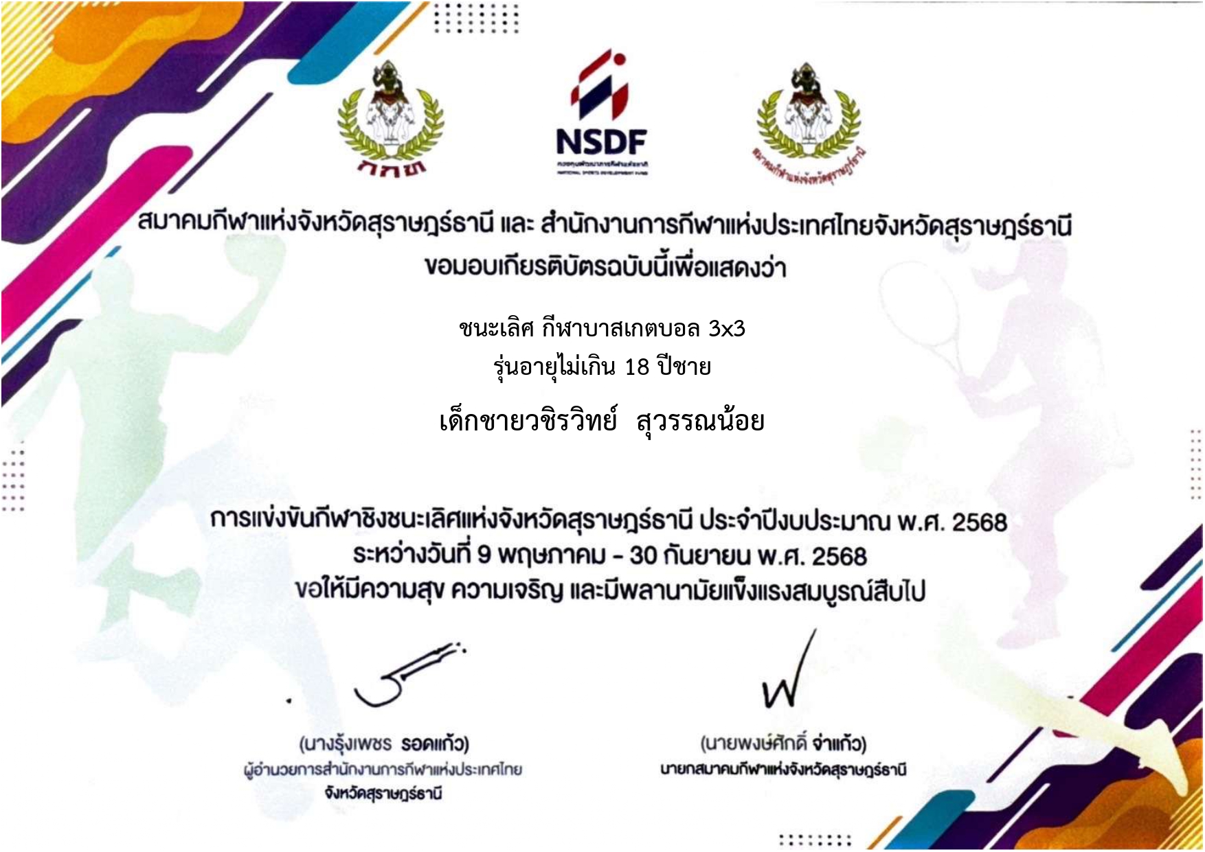 รางวัลรองชนะเลิศอันดับ 1 กีฬาบาสเกตบอล 3x3 รุ่นอายุไม่เกิน 15 ปีชาย การแข่งขันมหกรรมกีฬาชิงชนะเลิศแห่งจังหวัดสุราษฎร์ธานี ประจำปีงบประมาณ 2568 ณ สนามบาสเกตบอลเพชรศรีวิชัย เอนเตอร์ไพร์สจำกัด จังหวัดสุราษฎร์ธานี |