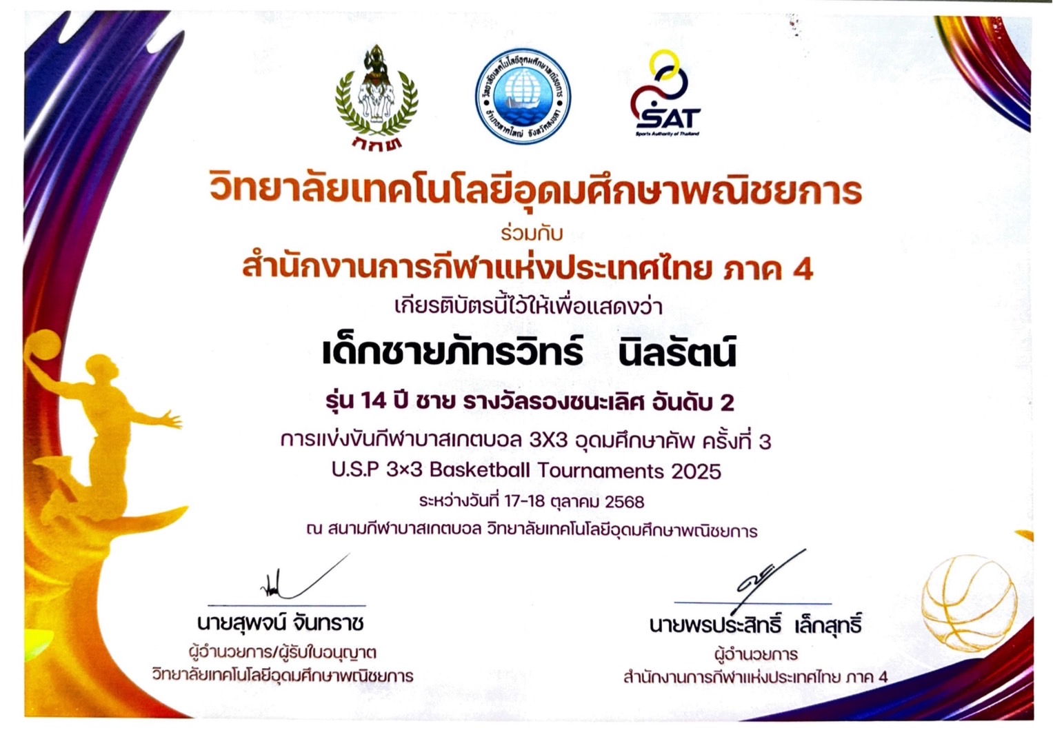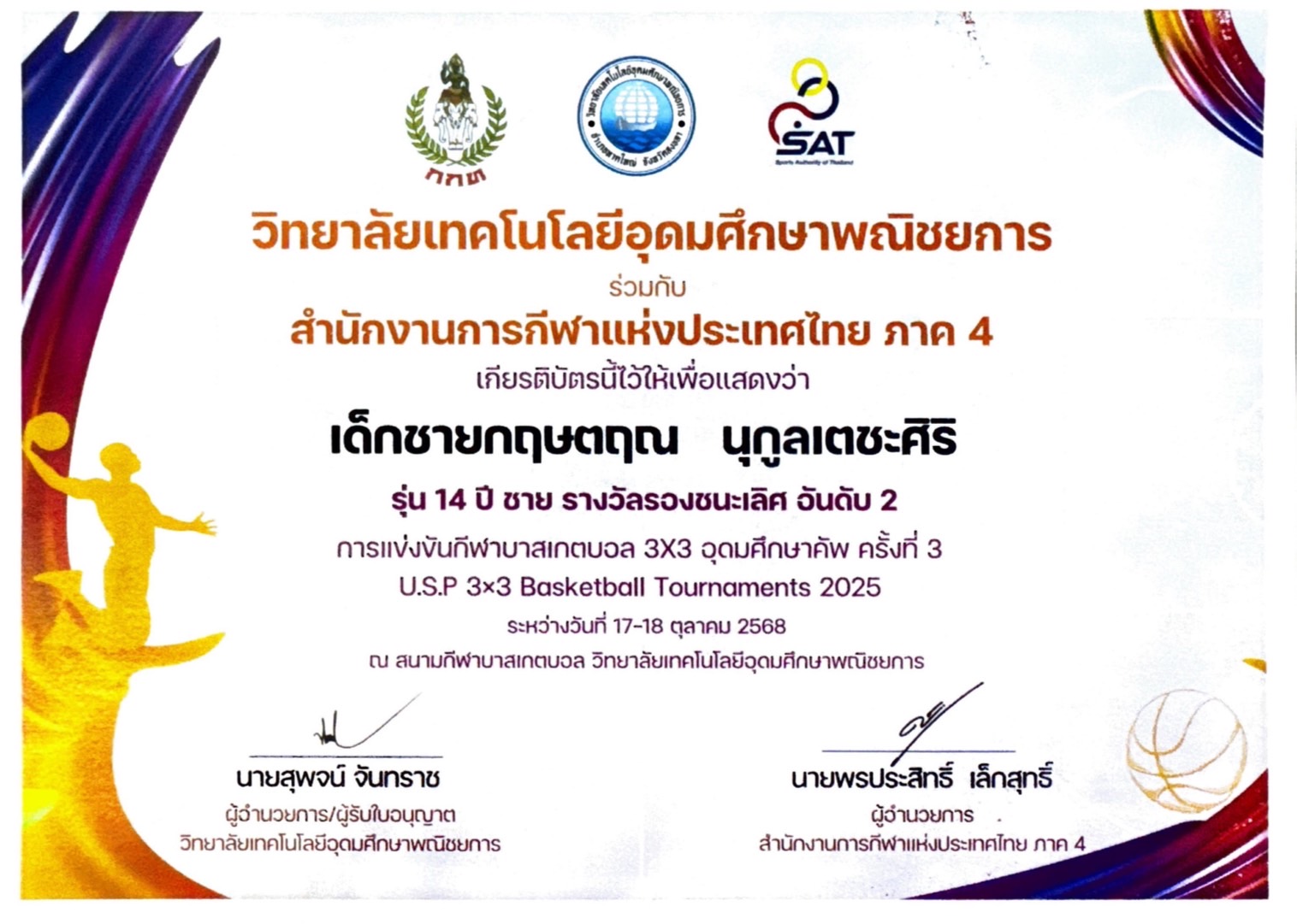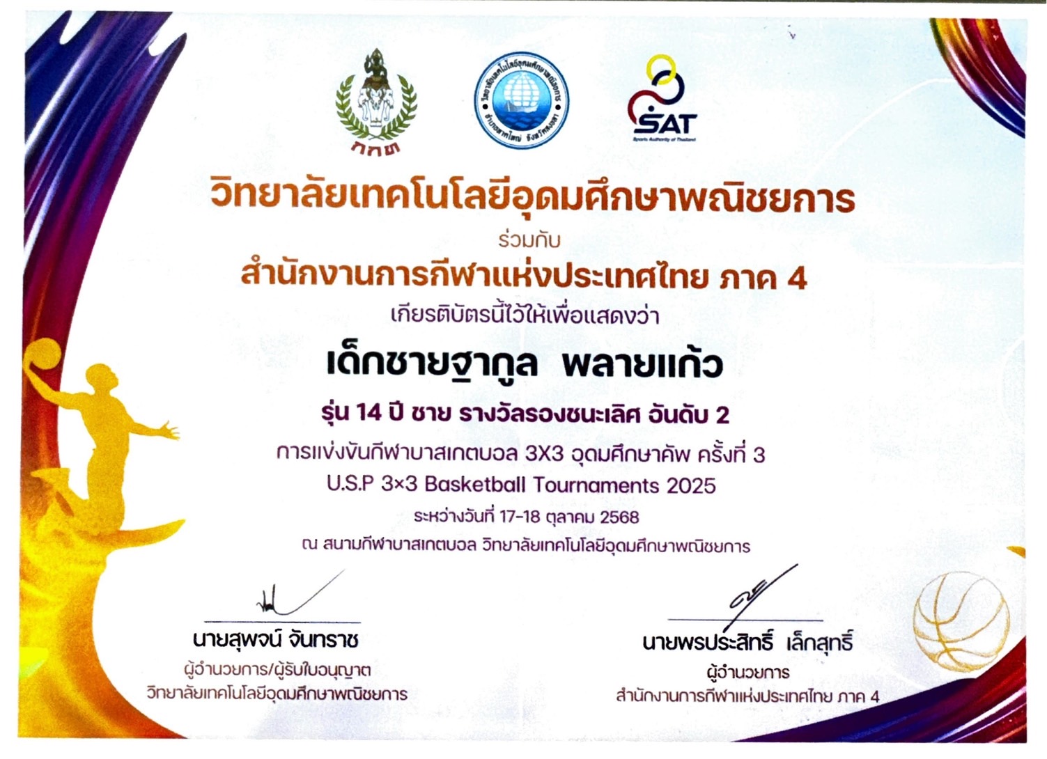 รางวัลรองชนะเลิศอันดับ 2 บาสเกตบอล 3x3 รุ่นอายุไม่เกิน 14 ปีชาย การแข่งขันกีฬาบาสเกตบอล 3x3 อุดมศึกษาคัพ ครั้งที่ 3 U.S.P. 3x3 Basketball Tournaments 2025 ณ วิทยาลัยเทคโนโลยีอุดมศึกษาพาณิชยการ จังหวัดสงขลา |
