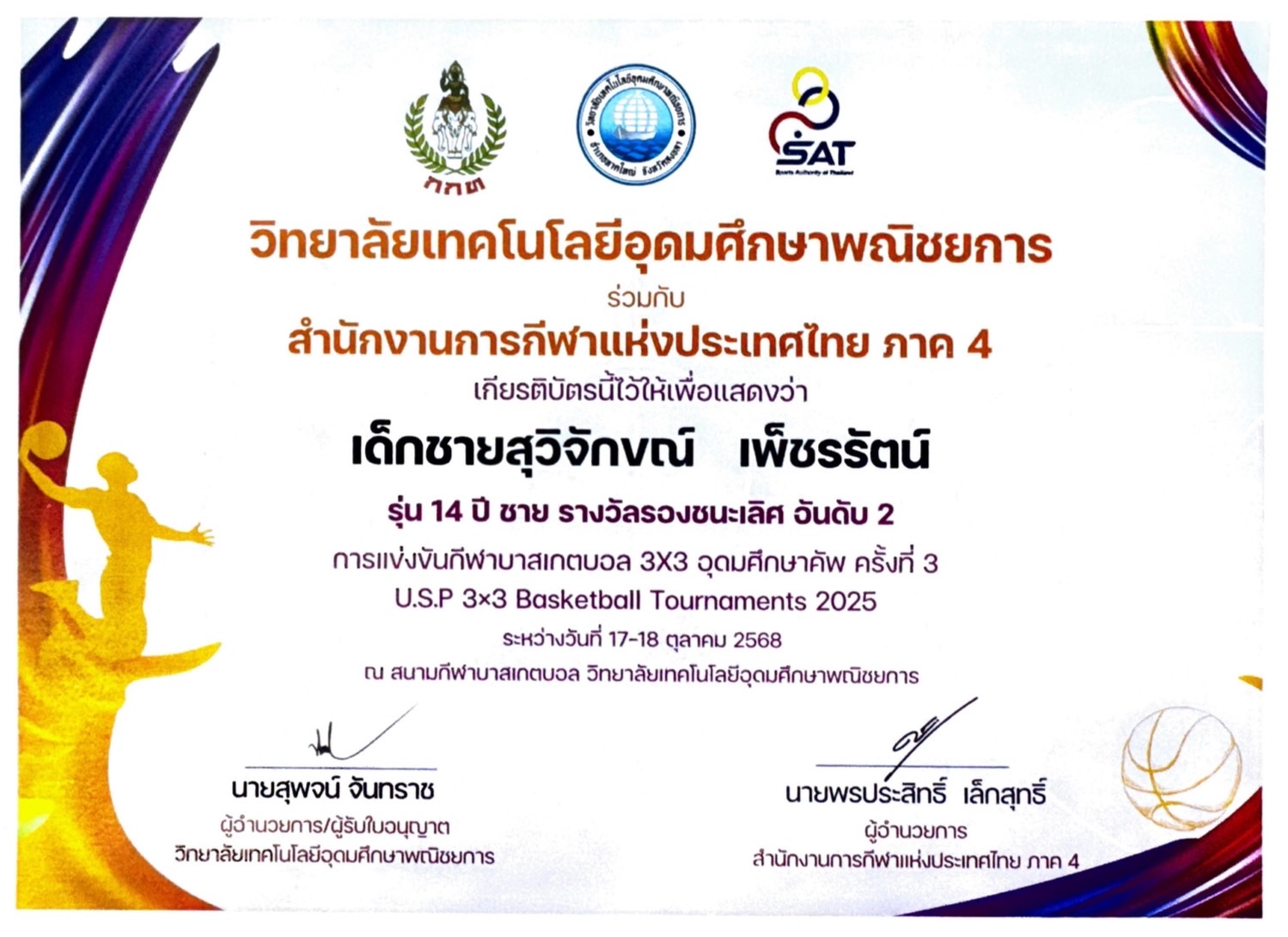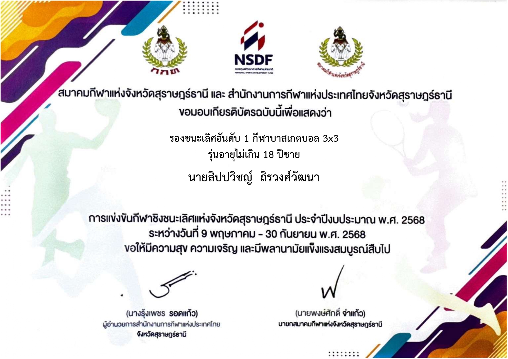 รางวัลรองชนะเลิศอันดับ 1 กีฬาบาสเกตบอล 3x3 รุ่นอายุไม่เกิน 18 ปีชาย การแข่งขันมหกรรมกีฬาชิงชนะเลิศแห่งจังหวัดสุราษฎร์ธานี ประจำปีงบประมาณ 2568 ณ สนามบาสเกตบอลเพชรศรีวิชัย เอนเตอร์ไพร์สจำกัด จังหวัดสุราษฎร์ธานี |