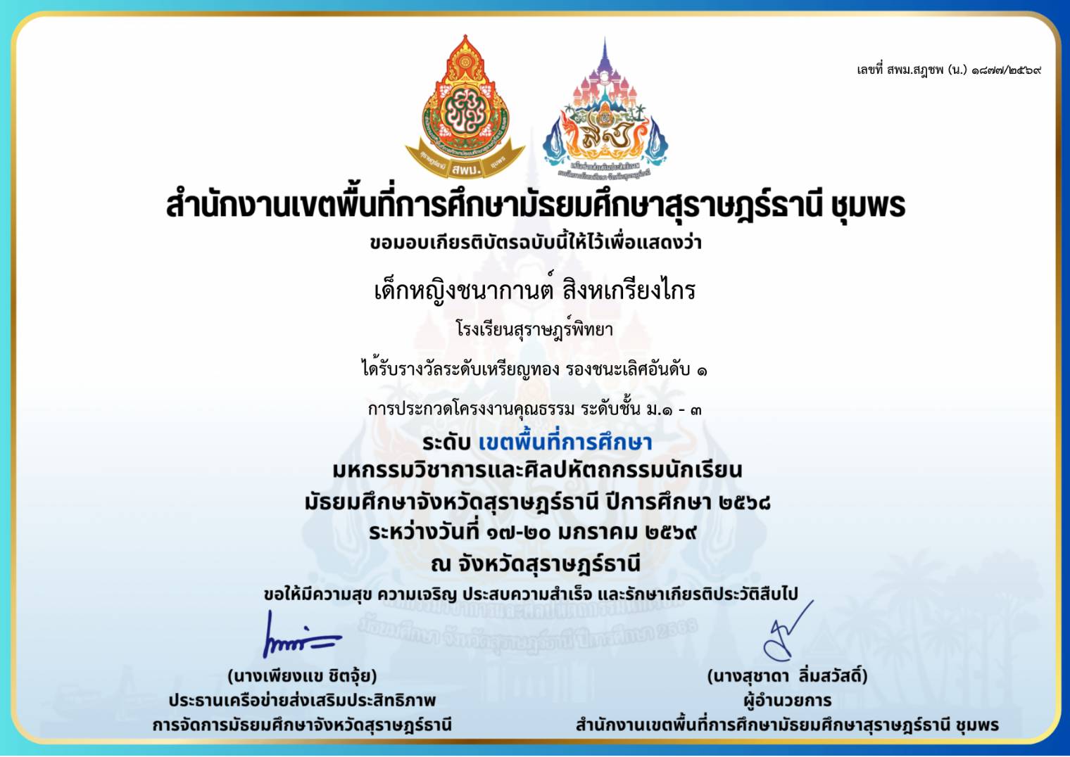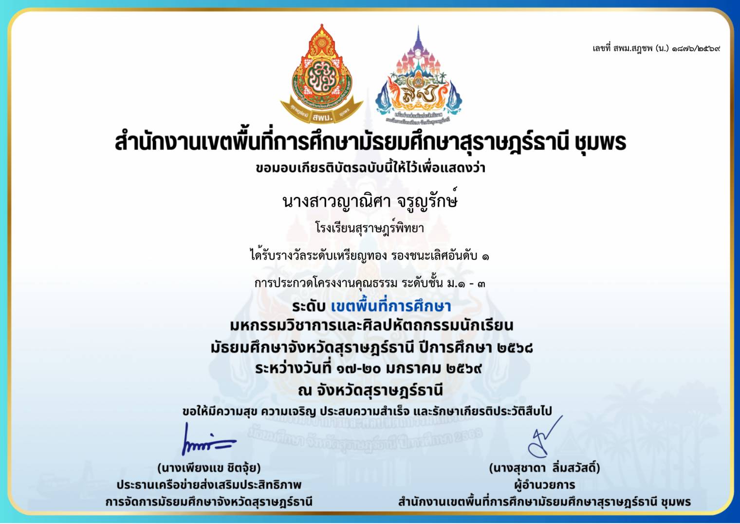 ได้รับรางวัลระดับเหรียญทอง รองชนะเลิศอันดับ 1 การประกวดโครงงานคุณธรรม ระดับชั้น ม.1 - ม.3 |