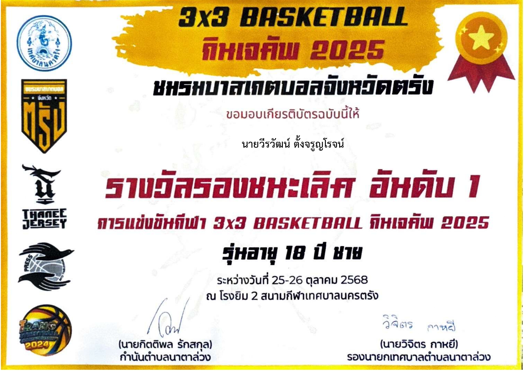รางวัลรองชนะเลิศอันดับ 1 บาสเกตบอล 3x3 รุ่นอายุไม่เกิน 18 ปีชาย การแข่งขันกีฬาบาสเกตบอล 3x3 กินเจ คัพ 2025 ณ สนามกีฬาเทศบาลนครตรัง |