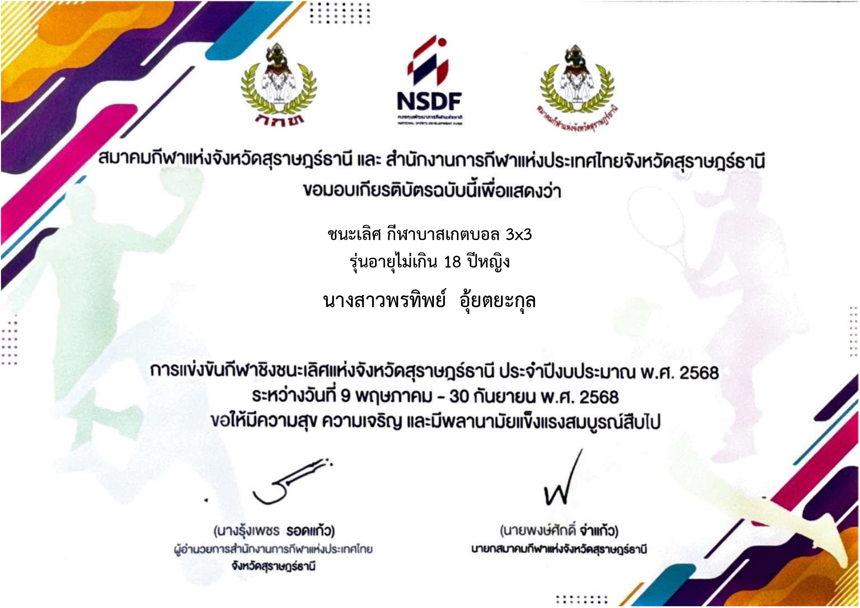 รางวัลชนะเลิศ กีฬาบาสเกตบอล 3x3 รุ่นอายุไม่เกิน 18 ปีหญิง การแข่งขันมหกรรมกีฬาชิงชนะเลิศแห่งจังหวัดสุราษฎร์ธานี ประจำปีงบประมาณ 2568 ณ สนามบาสเกตบอลเพชรศรีวิชัย เอนเตอร์ไพร์สจำกัด จังหวัดสุราษฎร์ธานี |