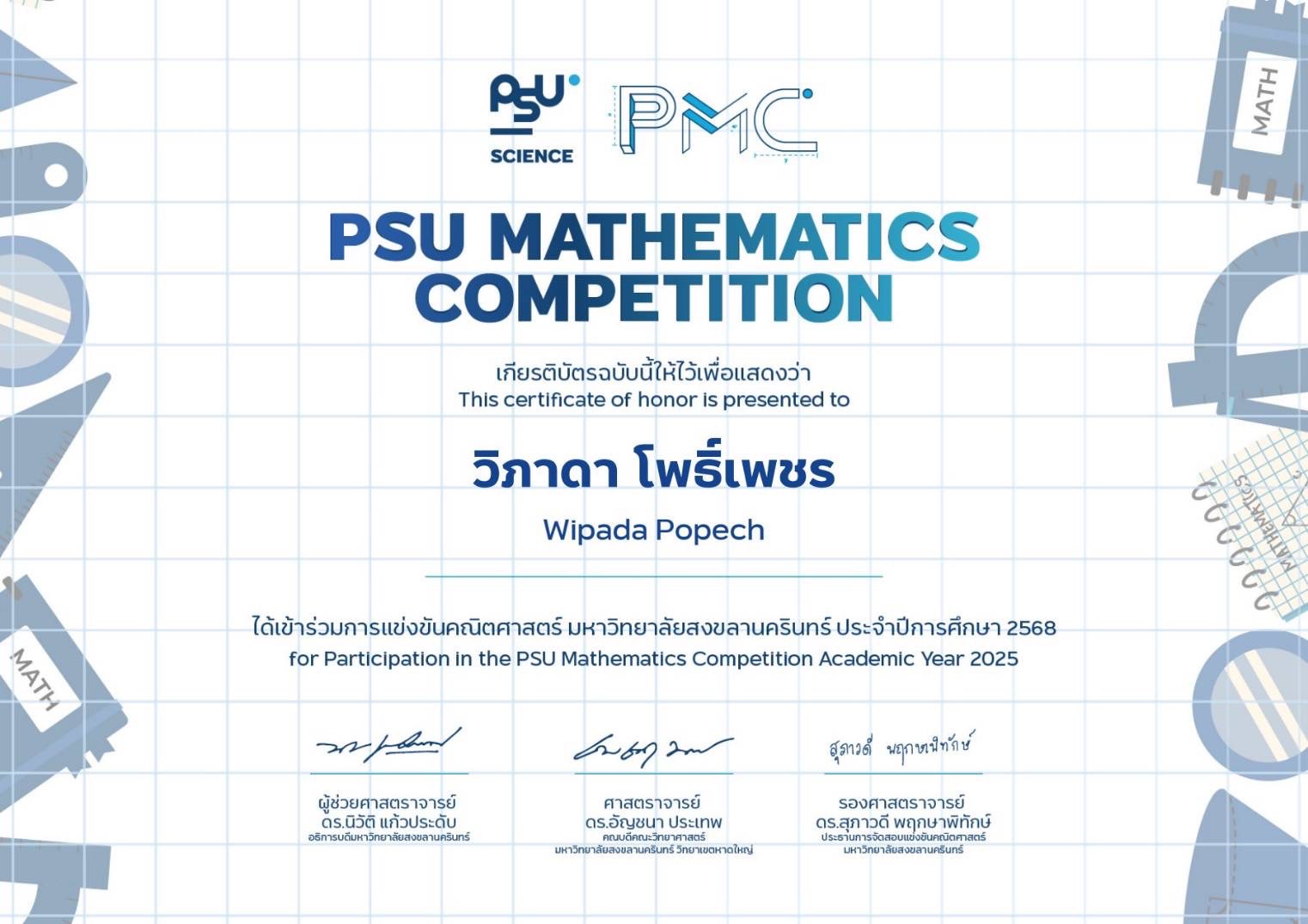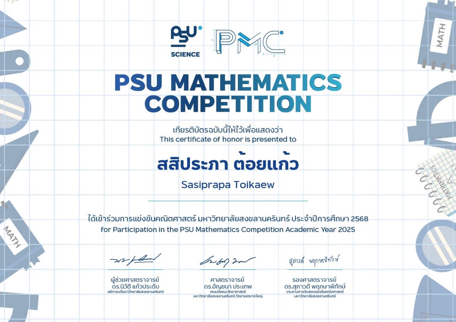 รางวัลการเข้าร่วมแข่งขันคณิตศาสตร์