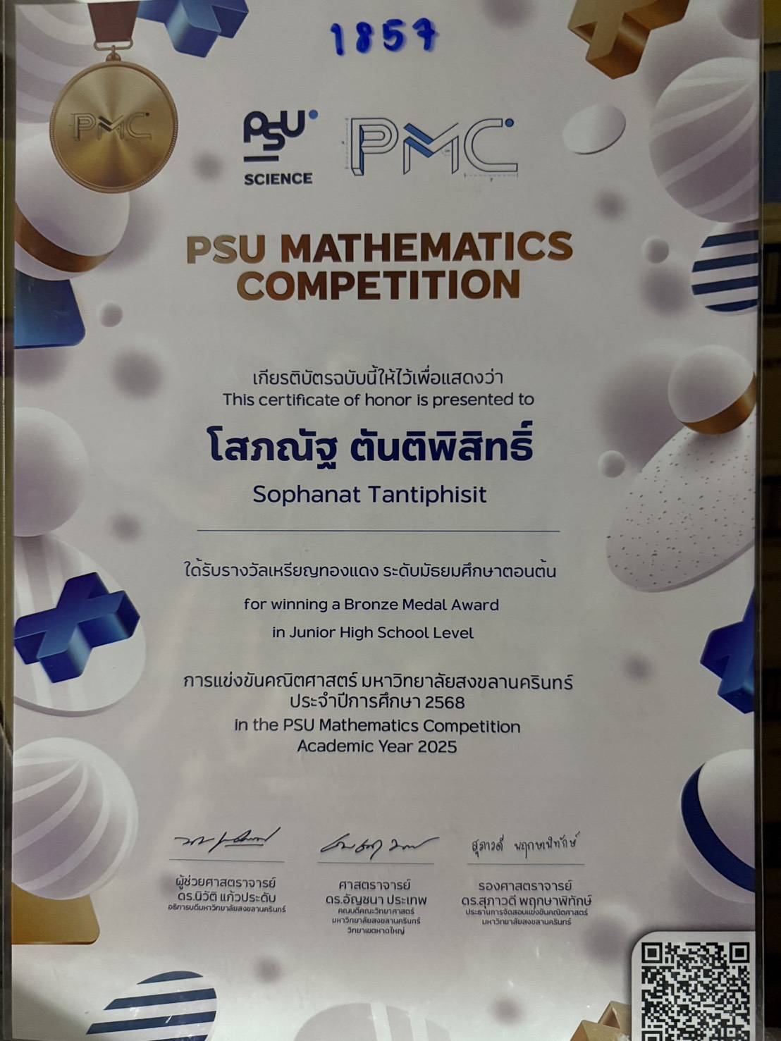 รางวัลเหรียญทองแดง การเข้าร่วมแข่งขันคณิตศาสตร์